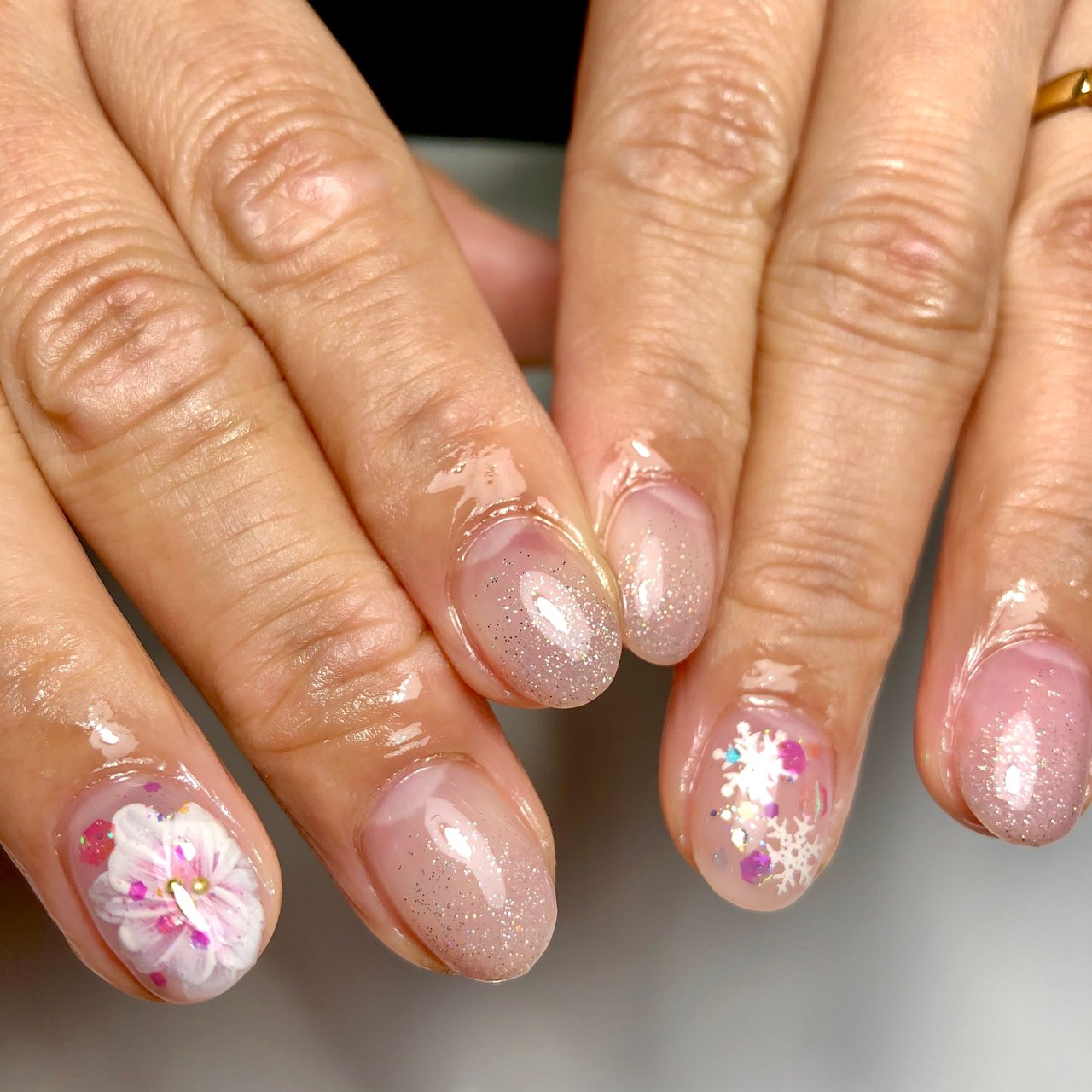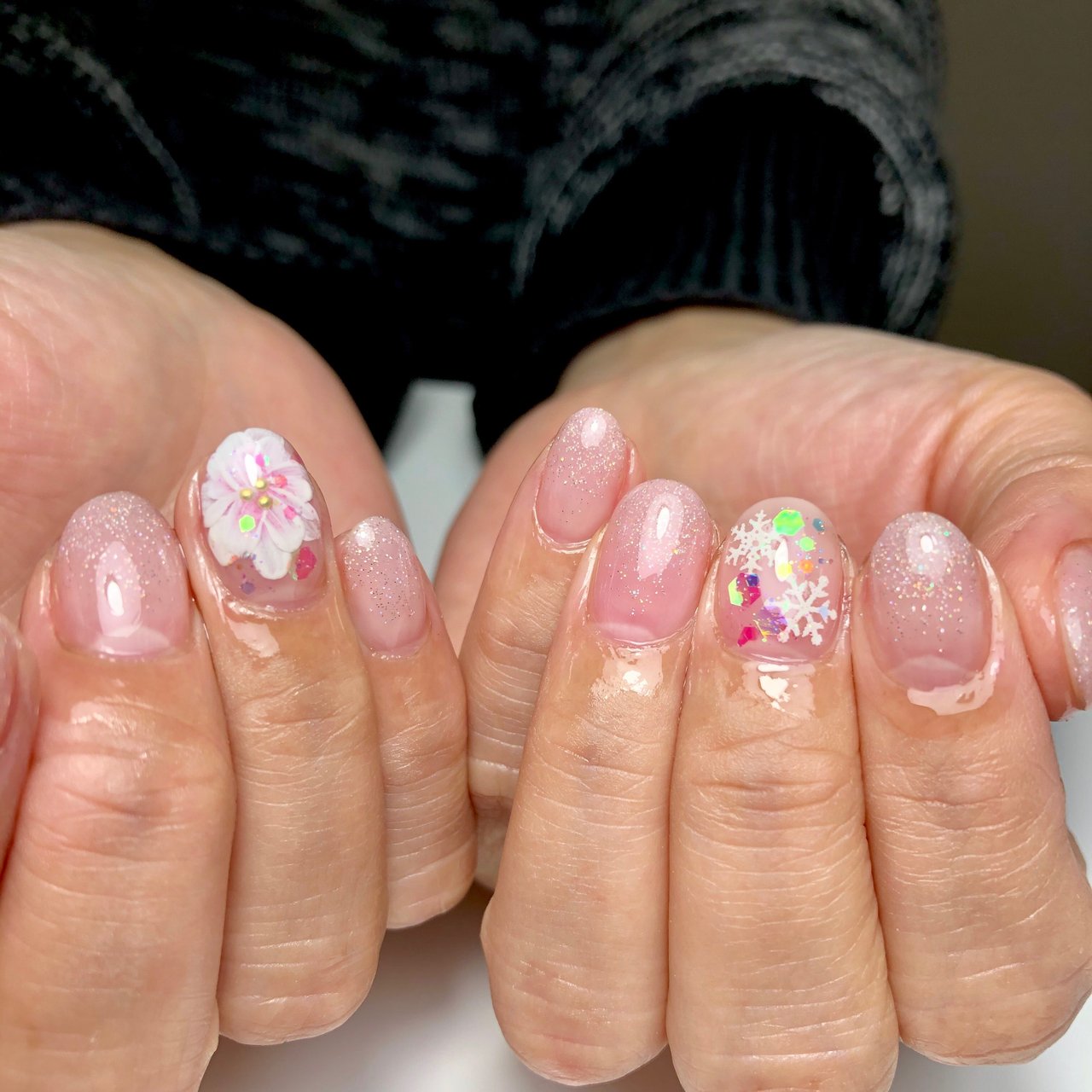 春 フラワーネイル 手描きアート 花 ふんわり ぼかし 入学式 卒業式 ブライダル 成人式 桜 マグネットジェル ふれん