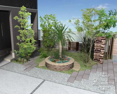 施工例シンボルツリー 斑入りシマトネリコ 常緑樹 下草 低木 植栽 レンガ花壇 サークルデザイン 現場番号 00016407