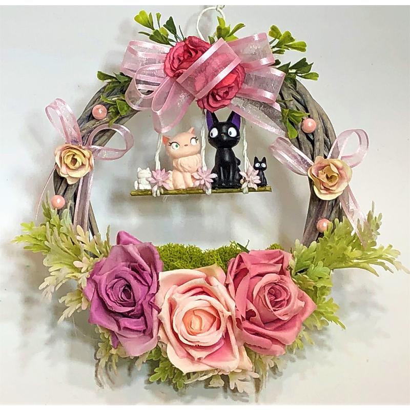 猫 ジブリ 魔女の宅急便 花 アレンジ プレゼント スピンオフ ジジとリリーと薔薇の園リース 232 はなやはなや 通販 yahoo ショッピング