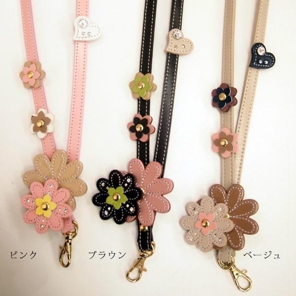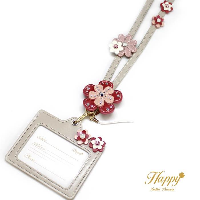 happy ネックストラップ 首 本革 5弁 フラワー 花 名入れ キラキラ スワロフスキー 日本製 本革 レディース 大人 かわいい おしゃれ 女性 ネーム ホルダー id ic カード 定期入れ 社員証 パス ケース 携帯 スマホ iphone デジカメ 落下防止
