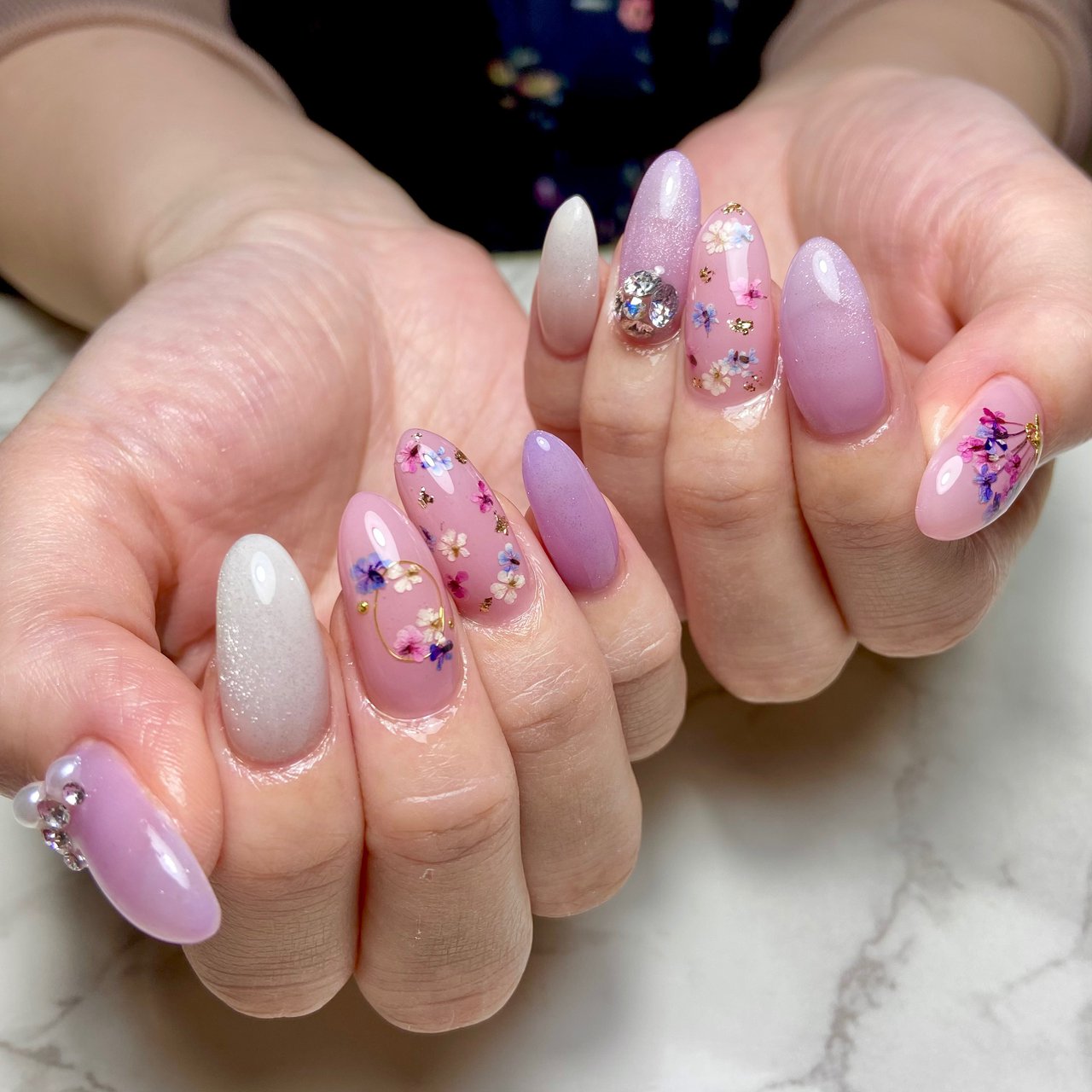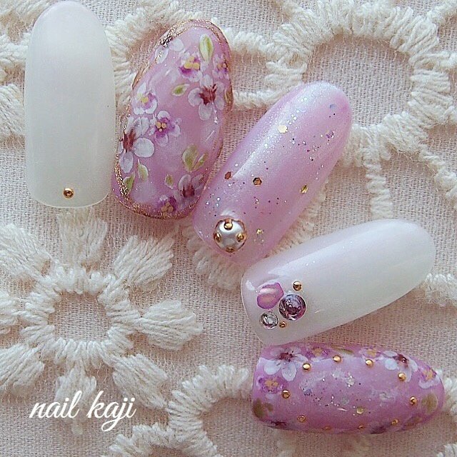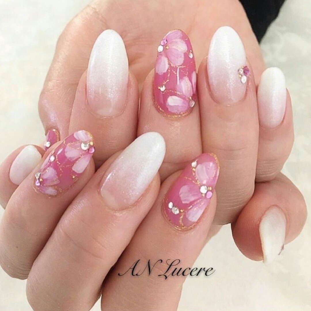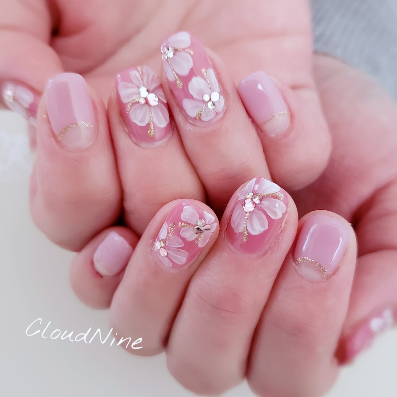 春ネイル ジェル90minピンクフレンチ花 レーヌ ネイルサロンreine のネイル ネイルクルー