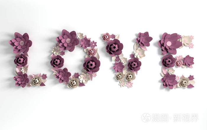 三维渲染文字爱由纸花和树叶在白色背景 现代纸艺设计的卡片或横幅为2月14日情人节婚礼 照片 正版商用图片18c7aa 摄图新视界