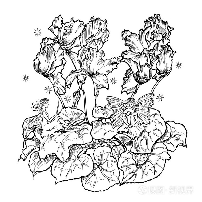 花の妖精たちの塗り絵の下絵 画像
