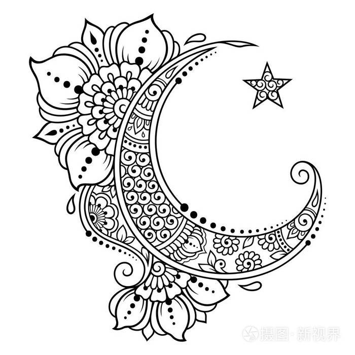 宗教伊斯兰象征的星星和月牙与花在明迪风格 制作和纹身的装饰标志 东部穆斯林的意符 插画 正版商用图片16b06f 摄图新视界