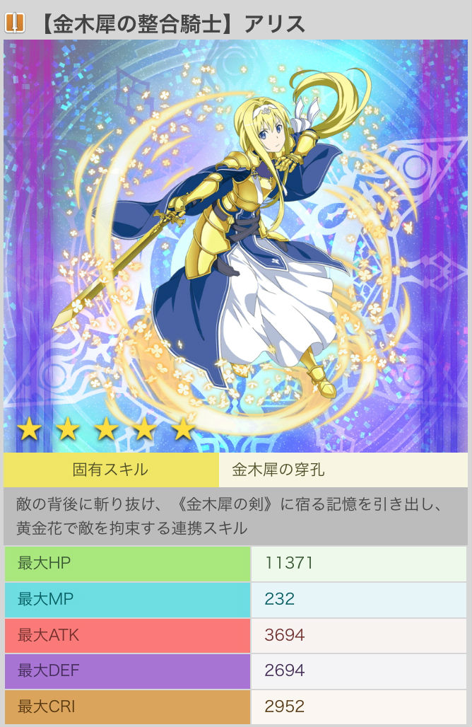 メモリーデフラグ攻略 新 5キャラクター 金木犀の整合騎士 アリス 土 片手剣 のステータス詳細 ソードアート オンライン メモリー デフラグ攻略速報 saoメモデフ最新情報まとめ