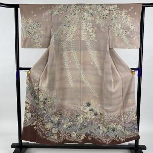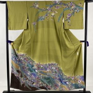 鶯茶 叩き染めに辻が花 訪問着 落款入り作家物